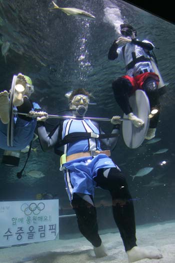 A diver lifts weights and his fellow divers in an aquarium during a diving performance related to the 2008 Beijing Olympics at the Coex Aquarium in Seoul August 4, 2008. The Korean reads, "Let's cheer together! Water Olympics". [Agencies]