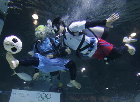 Divers play soccer in an aquarium during a diving performance related to the 2008 Beijing Olympics at the Coex Aquarium in Seoul August 4, 2008. [Agencies]