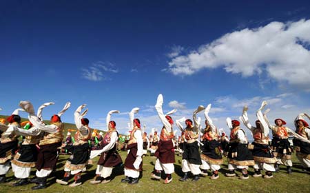 Tibetan herdsmen perform the Guozhuang dance, a folk dance popular among the Tibetan ethnic group, to celebrate the forthcoming Beijing 2008 Olympic Games on the Nagqu Grassland in Nagqu, southwest China's Tibet Autonomous Region, Aug 4, 2008. [Xinhua]