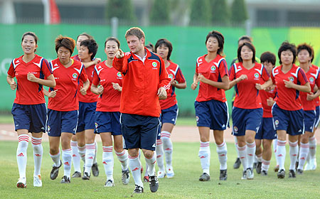 The Chinese women's football team during training at Tianjin Olympic Center Stadium, August 4, 2008. Their first Olympic football match is on August 6, 2008, against Sweden. [Xinhua]
