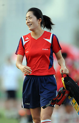 Chinese football player Pu Wei prepares for training at the Tianjin Olympic Center Stadium, August 4, 2008. Their first Olympic football match is on August 6, 2008, against Sweden. [Xinhua]