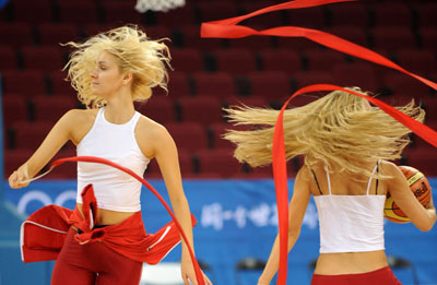 Ukrainian members of Beijing Dream Dance Cheer Squad take part in a rehearsal August 4th, 2008 at the Wukesong Indoor Stadium, which will host the basketball competitions in Beijing from August 10 to 24. [Xinhua]