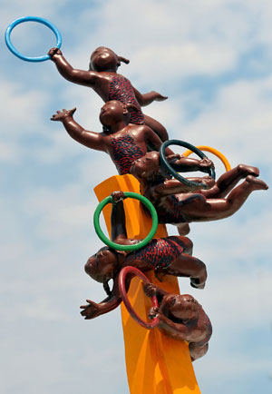 Sculpture "One Dream," which depicts children playing with the Olympic Rings, is seen in this photo taken on August 4, 2008, in the Qingdao Olympic Park in Qingdao, a co-host city to host the sailing events during the Olympic Games. This and hundreds of other works will be displayed in the Park throughout the Games as part of the 2008 Olympic Landscaping Sculpture Global Exhibition. [Xinhua]
