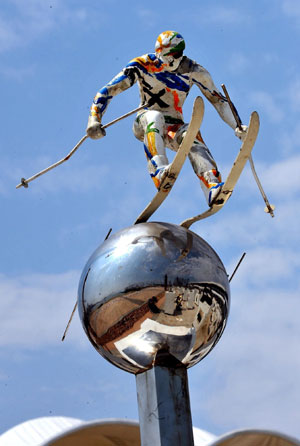 Sculpture "Dashing to the Finish" is seen in this photo taken on August 4, 2008, in the Qingdao Olympic Park in Qingdao, a co-host city to host the sailing events during the Olympic Games. This and hundreds of other state-of-the-art sculptures will be displayed in the Park throughout the Games. [Xinhua]