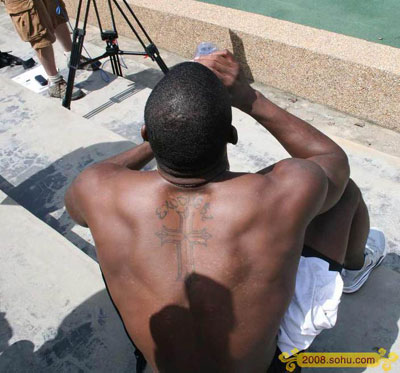 The solid back of one of Liu Xiang's rivals, American David Oliver, after he had his first training session in Dalian August 2nd, 2008. He was in good shape and high spirits. [www.sohu.com]