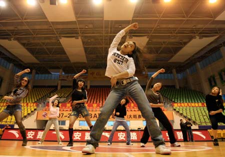Members of "Dance Fashion" cheerleading squad train before a basketball game in Guangzhou, capital of south China's Guangdong Province, Dec. 2007. [Xinhua]