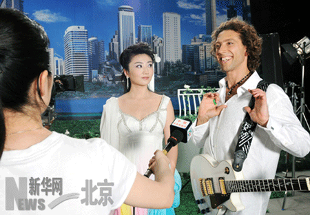 US pop singer Troy Lush(R), the writer and composer of "The Power of Agglomeration", a Beijing Olympic Games themed MTV song, is taking an interview in Beijing, Aug. 4, 2008. The song, specially dedicated to the 2008 Beijing Games, highlights the cohesive power of the Games as symbol of harmony and friendship. The MTV song by Chinese soprano Zhu Jiali (L) and Troy Lush, is currently being shot and will be broadcast worldwide during the Games. [www.bj.xinhuanet.com]