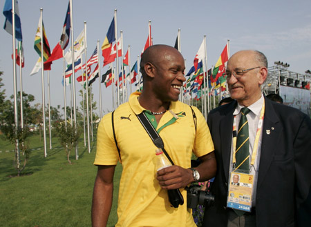Sprinter Asafa Powell (L) of Jamaica chats with Mike Fennell, chief of the Jamaica Olympic Association, at a flag-raising ceremony ahead of the Beijing 2008 Olympic Games August 5, 2008. [Agencies]