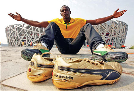 Current world 100m record holder Usain Bolt of Jamaica poses for a picture in front of the National Stadium, also known as the Bird's Nest, ahead of the Beijing Olympic Games yesterday. [Agencies]