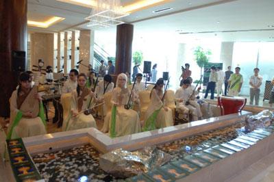 The members of China Disabled People's Performing Art Troupe (CDPPAT) practice the bewitching performance of Thousand-hand Bodhisattva dance in a hotel of Beijing Olympic Village,, August4, 2008, just ahead of the Games opener.[www.sohu.com]