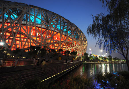 The National Stadium, also known as the Bird's Nest gives off a colorful glow during the last rehearsal for the Beijing Olympic Games opening ceremony on Tuesday, August 5, 2008. [Xinhua]