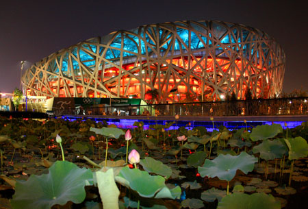 The National Stadium, also known as the Bird's Nest looks dreamlike surrounded by fresh lotus flowers during the last rehearsal for the Beijing Olympic Games opening ceremony on Tuesday, August 5, 2008. [Xinhua]