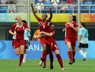 Candace Chapman of Canada celebrates with her teammates after scoring a goal against Argentina during the first round group E women's football match at the Tianjin Olympic Center Stadium on August 6, 2008. Canada beat Argentina 2-1. [Agencies]