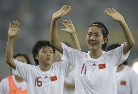 China's Wang Dandan (L) and Pu Wei greet the crowd after their Group E first round women's soccer match against Sweden at the Beijing 2008 Olympic Games in Tianjin August 6, 2008. China defeated Sweden 2-1.[Agencies]
