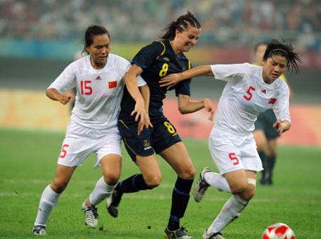 Lotta Schelin of Sweden (C) vies with Zhou Gaoping (L) and Weng Xinzhi of China during their 2008 Beijing Olympic Games first round Group E women's football match at the Tianjin Olympic Center Stadium on August 6, 2008. China defeated Sweden 2-1. [Agencies]