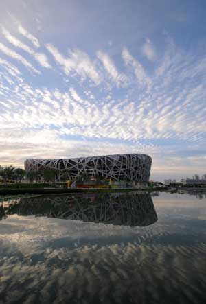 The photo taken on Aug. 1, 2008 shows the National Stadium, namely the Bird's Nest, standing with its reflection image under the blue sky in Beijing, capital of China. [Xinhua]