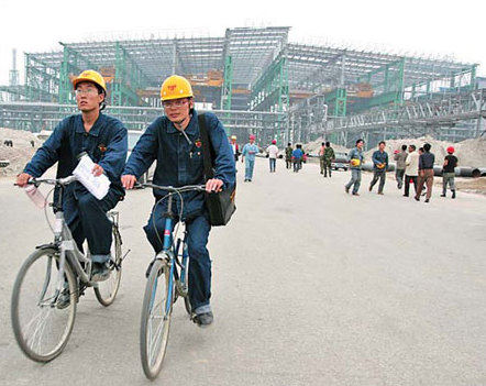 Workers ride bikes through a Shougang construction site in Caofeidian. [China Daily]