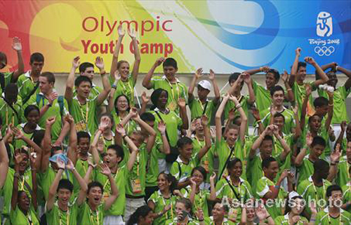 Members of the Beijing 2008 Olympic Youth Camp cheer for the camp’s opening, August 6, 2008. More than 480 young people from all over the world were selected to join the camp in Beijing to share in the Olympics. [Asianewsphoto]