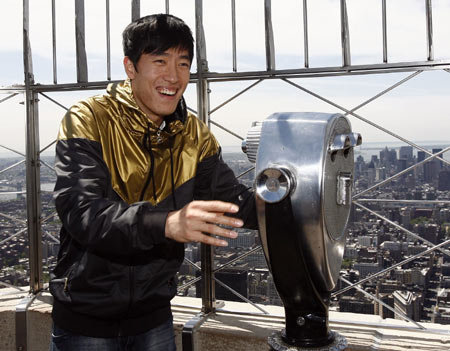 Liu Xiang, Chinese track and field star and Olympic gold medallist, smiles during a news conference at the top of the Empire State Building in New York May 28, 2008. [Xinhua]