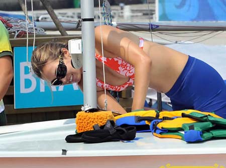 An Olympic sailor checks her sail at the Qingdao Olympic Sailing Center, August 6, 2008. [Sohu.com]