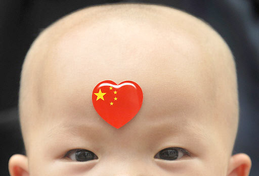 | A babygirl with a heart-shaped Chinese flag stuck to her forehead sits in a pushchair on August 6, 2008 in the center of Beijing, two days before the beginning of the 2008 Beijing Olympic Games. The 2008 Beijing Olympic Games will be held in China from August 8 to 24. [Agencies] |