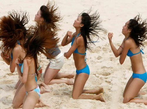 Cheerleaders for Olympic beach volleyball perform during a practice session.