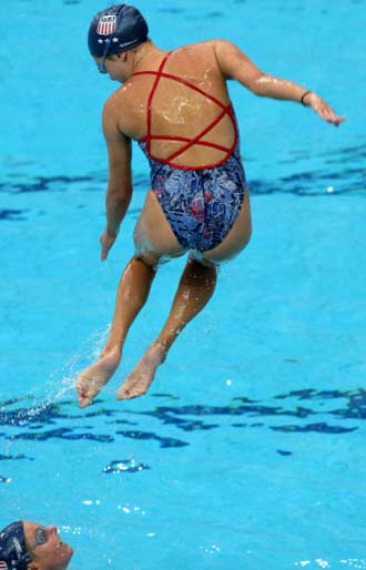 Members of the US synchronised swimming team practice at the National Aquatics Center, otherwise known as the Water Cube, in preparation for the upcoming 2008 Beijing Olympic Games, in Beijing on August 7, 2008. The 2008 Beijing Olympic Games opens on August 8. [Agencies]