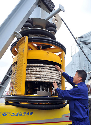 A maritime technical soldier examines the submersible robot which will be employed to take underwater pictures of the area.[Xinhua]