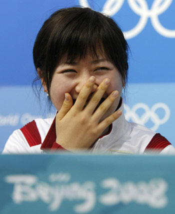 Japanese table tennis player Ai Fukuhara covers her mouth while laughing as she speaks to the media during a news conference at the Olympic Village in Beijing, ahead of the 2008 Olympic Games, August 7, 2008. [Agencies]