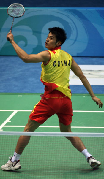 Badminton player Lin Dan of China plays a shot during a training session at the Beijing University of Technology Gymnasium in Beijing on August 7, 2008, the day before the opening of the 2008 Beijing Olympic Games. Lin Dan and his comrades launch their bid for a clean sweep of the Olympic gold medals in badminton on August 9, with arch rivals Malaysia, Indonesia and South Korea determined to halt the charge. [Agencies]