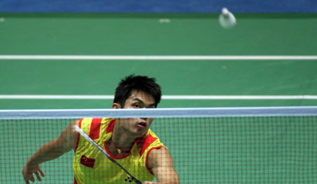 Badminton player Lin Dan of China plays a shot during a training session at the Beijing University of Technology Gymnasium in Beijing on August 7, 2008, the day before the opening of the 2008 Beijing Olympic Games. Lin Dan and his comrades launch their bid for a clean sweep of the Olympic gold medals in badminton on August 9, with arch rivals Malaysia, Indonesia and South Korea determined to halt the charge. [Agencies]