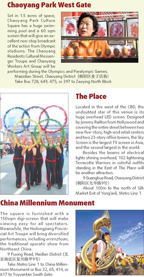 The Beijing sites will enable people to view tonight's opening ceremony and everything else until the end of the Paralympic Games on September 17 on large, high-definition TV screens and at the same time, party and enjoy cultural entertainment presented by Chinese and foreign performers.