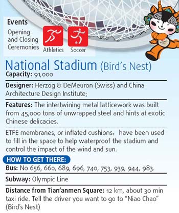 The opening ceremony starts at 8 pm today at the Bird's Nest - the National Stadium in the Olympic Central District in northern Beijing. At least 100,000 people including athletes, world leaders, Games officials and spectators are expected to attend. The stadium and the whole Olympic core area will formally open to the public from 4 pm. Guests, athletes and artists will take chartered buses.