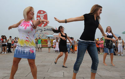 Members of the Christian Dove Dance group from Oklahoma in the US hold an impromptu dance on Tiananmen Square in Beijing on August 7, 2008. [Agencies]