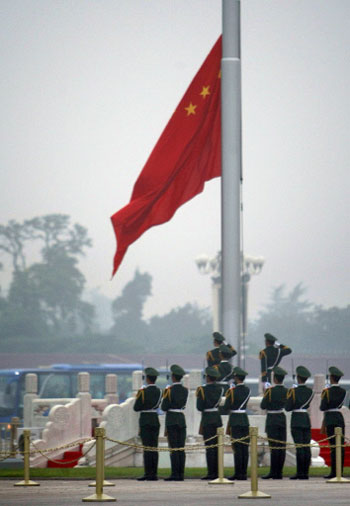 The Chinese flag is raised during a ceremony at Tiananmen Square in Beijing on August 8th, 2008 on the morning of the opening of the 2008 Beijing Olympic Games. [Agencies]