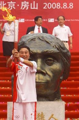 Torchbearer Feng Gong holds up the Olympic torch at the start of the last-day of Beijing Olympic Games torch relay in Zhoukoudian of in Beijing August 8, 2008. [Xinhua]