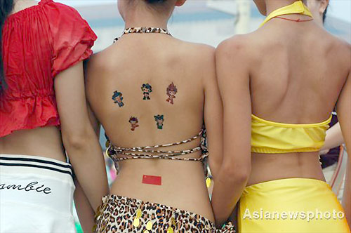 A girl (C) sticks on her back five pictures featuring Fuwas, the mascot for the Beijing Olympics, to welcome the coming Games inBeijing August 7, 2008. [Asianewsphoto]