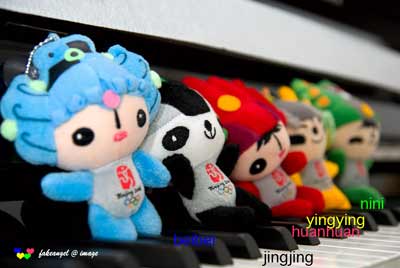 This is Fuwa, the Official Mascots of the Beijing 2008 Olympic Gamessitting on my piano. I like Jingjing best.