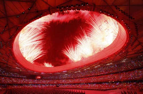 Fireworks are seen at the opening ceremony of the Beijing Olympic Games in the National Stadium Aug. 8, 2008. [Xinhua]