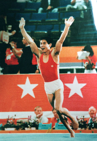 Li Ning cheers after he won the perfect 10 in men's floor exercise event at the 1984 Los Angeles Olympic Games in this file photo. Li has won three gold medals, two silver and one bronze at that Games and is named Gymnastics Prince in China. Now he is a successful businessman with his own sports goods company. [Xinhua]
