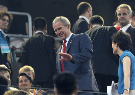 US President George W. Bush arrives for the opening ceremony of the 2008 Beijing Olympic Games in Beijing on August 8, 2008. The three-hour show at Beijing's iconic "Bird's Nest" national stadium is set to see more than 15,000 performers showcase the nation's ancient history and its development. [Agencies]