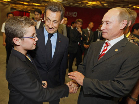 French President Nicolas Sarkozy (C) introduces his son Louis (L) to Russian Prime Minister Vladimir Putin (R) while visiting the VIP lounge at the National Stadium before the start of the opening ceremony of the 2008 Beijing Olympic Games on August 8, 2008.[Agencies]