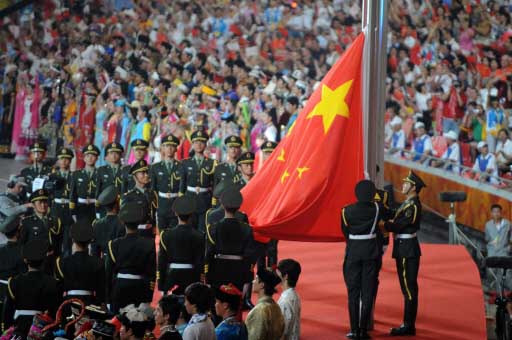 The Chinese national flag is raised during the opening ceremony of the 2008 Beijing Olympic Games in Beijing on August 8, 2008. The three-hour show at Beijing's iconic "Bird's Nest" national stadium is set to see more than 15,000 performers showcase the nation's ancient history and its development.[Agencies]