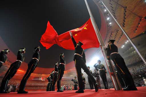 The Chinese national flag is raised during the opening ceremony of the 2008 Beijing Olympic Games in Beijing on August 8, 2008. The three-hour show at Beijing's iconic "Bird's Nest" national stadium is set to see more than 15,000 performers showcase the nation's ancient history and its development.[Agencies]