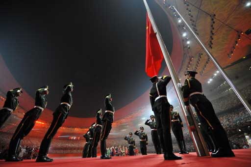 The Chinese flag is raised during the opening ceremony of the 2008 Beijing Olympic Games in Beijing on August 8, 2008. The three-hour show at Beijing's iconic "Bird's Nest" national stadium is set to see more than 15,000 performers showcase the nation's ancient history and its development. [Agencies]
