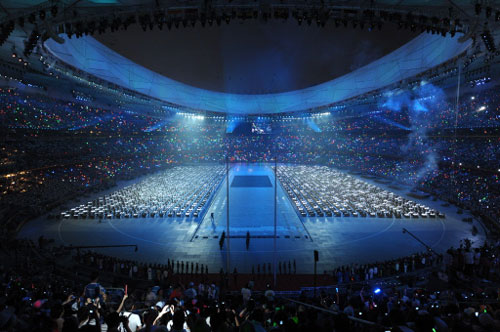 General view shows the start of the opening ceremony of the 2008 Beijing Olympic Games in Beijing on August 8, 2008. The three-hour show at Beijing's iconic "Bird's Nest" national stadium is set to see more than 15,000 performers showcase the nation's ancient history and its rise as a modern power.[Agencies]