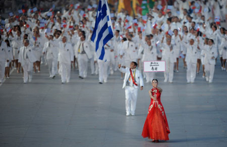 Judo athlete Ilias Iliadis, Greece's flag bearer, parade with in front of his delegation during the 2008 Beijing Olympic Games opening ceremony on August 8, 2008 at the National Stadium in Beijing. Over 10,000 athletes from some 200 countries and regions are going to compete in 38 different disciplines during the event, between August 9 to 24. [Agencies]