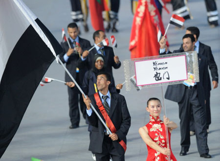 Athlete Mohammed Al-Yafaee (C), Yemen's flag bearer, parade in front of his delegation during the 2008 Beijing Olympic Games opening ceremony on August 8, 2008 at the National Stadium in Beijing. Over 10,000 athletes from some 200 countries and regions are going to compete in 38 different disciplines during the event, between August 9 to 24. [Agencies]
