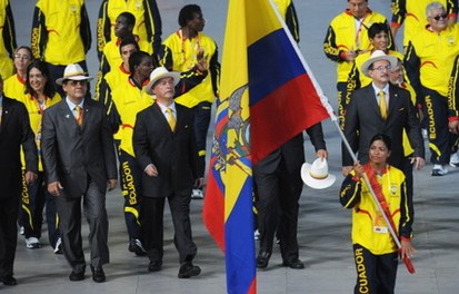 | Athlete Alexandra Escobar (C), Ecuador's flag bearer, parades in front of her delegation during the 2008 Beijing Olympic Games opening ceremony on August 8, 2008 at the National Stadium in Beijing. [Agencies] |