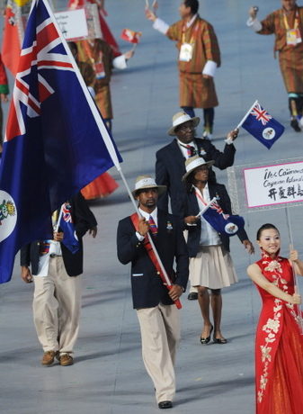 | Athlete Ronald Forbes (C), Cayman Islands' flag bearer, parades in front of his delegation during the 2008 Beijing Olympic Games opening ceremony on August 8, 2008 at the National Stadium in Beijing. [Agencies] |